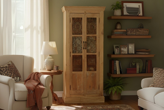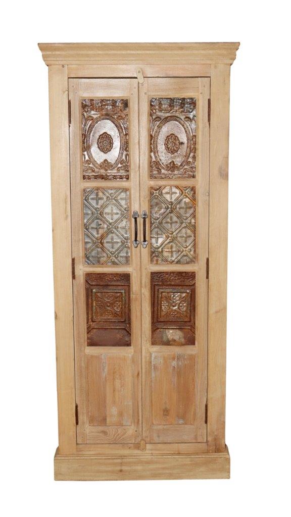 Command architectural presence in any room with the Antique Artisan Metal-Clad Solid Wood Armoire. This premium statement piece is masterfully handcrafted from solid wood, featuring a light, natural finish that highlights the authentic grain and warmth of the timber.