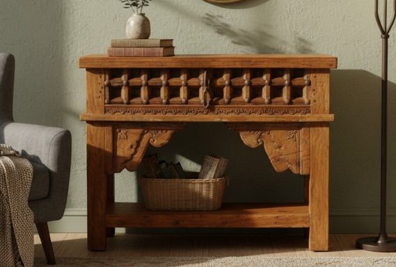 Command attention in your entryway or hallway with the Fortress Solid Wood Carved Console Table. This premium statement piece is masterfully handcrafted from solid wood, featuring a rich, honey-toned finish that highlights the authentic grain and historical character of the timber.