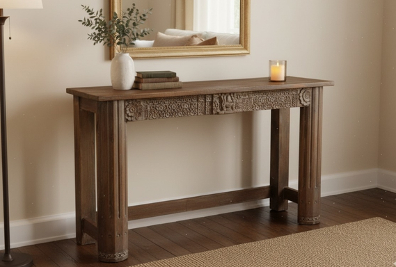 Grace your home with the intricate beauty of the Hand-Carved Solid Wood Console Table. This premium hall table is masterfully handcrafted from solid wood, showcasing a rich, warm grain and a timeless architectural silhouette.