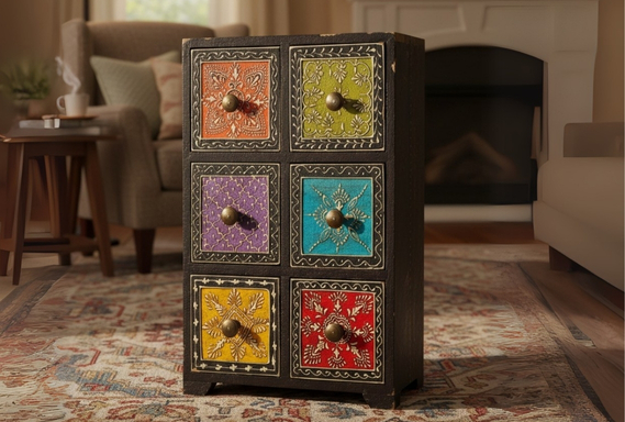 Organize your smallest treasures with the vibrant, soulful charm of the Hand-Painted Solid Wood 6-Drawer Miniature Piece. This premium miniature piece is masterfully handcrafted from solid wood, featuring a dark-stained frame that provides a sophisticated contrast to its brilliant, multi-colored drawer fronts.