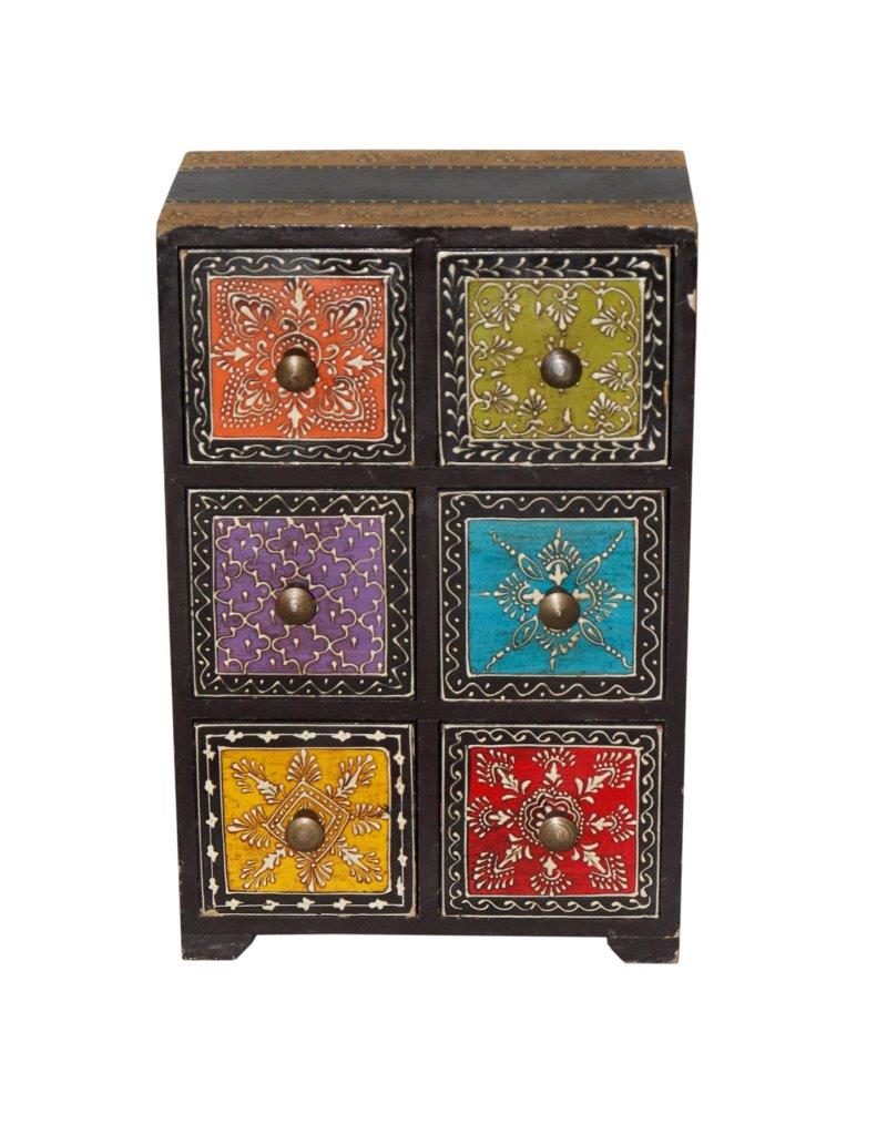 The design is truly majestic, showcasing six individual drawers, each adorned with unique, hand-painted artisan motifs—from intricate floral mandalas to delicate geometric patterns in hues of saffron, turquoise, and magenta. Finished with antique-style brass knobs and a decorative gilded border along the top, this reclaimed wood style miniature brings a touch of worldly folk art to your desktop, vanity, or luxury bookshelf.