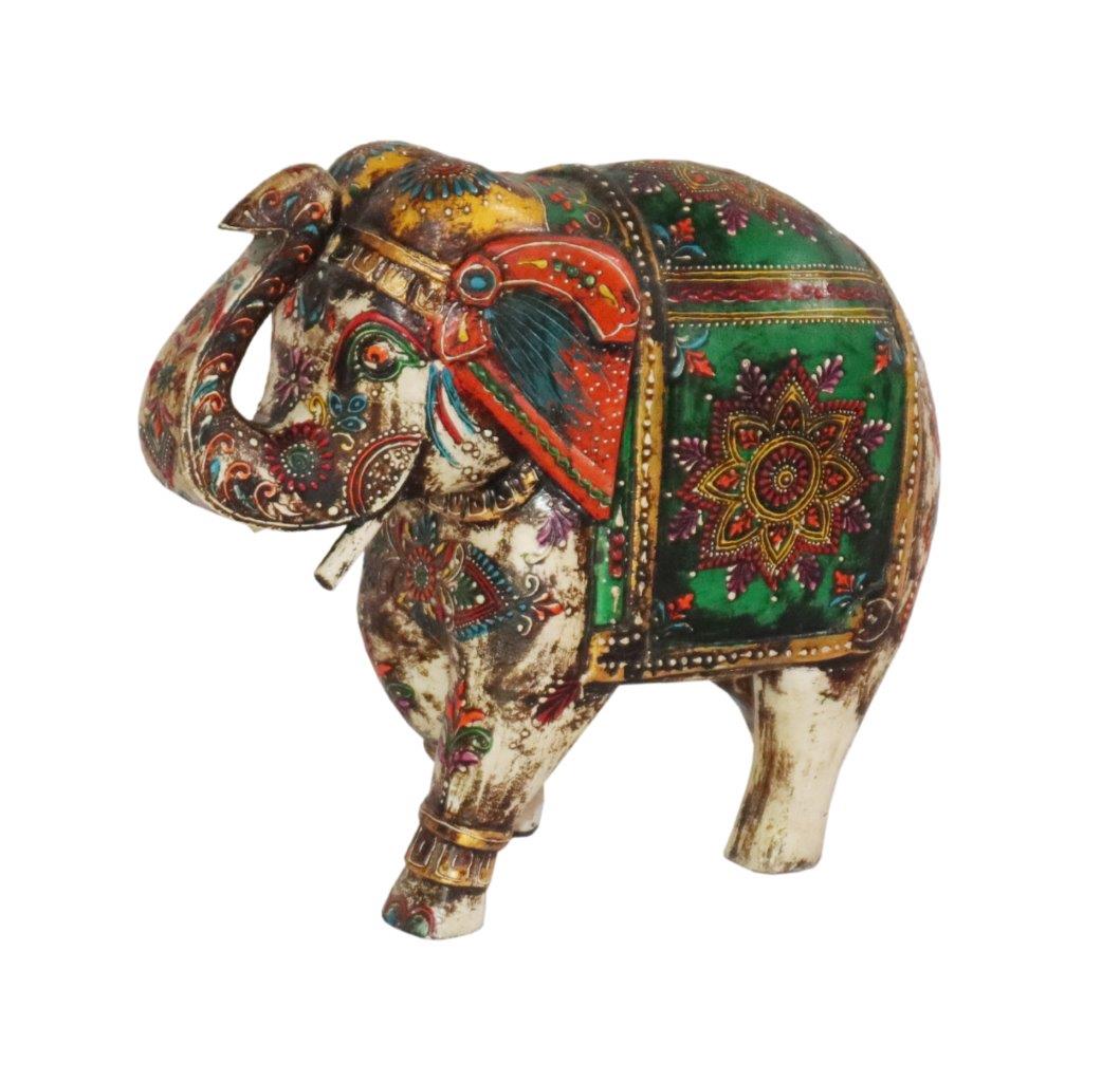 The detailing is truly breathtaking, featuring an ivory-toned base adorned with incredibly dense, hand-painted floral motifs and a vibrant emerald-green saddle. Gilded accents and intricate red-and-blue patterns wrap around the trunk and head, reflecting the storied aesthetic of reclaimed wood heritage pieces. With its trunk gracefully raised as a symbol of prosperity, this artisan miniature serves as a sophisticated accent for luxury bookshelves, mantels, or curios.