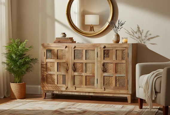 Infuse your home with the storied charm of the Reclaimed Wood 3 Door Antique Buffet. This premium three-door buffet is expertly handcrafted from reclaimed wood, celebrating a weathered, sun-bleached patina that highlights the organic beauty of aged timber.