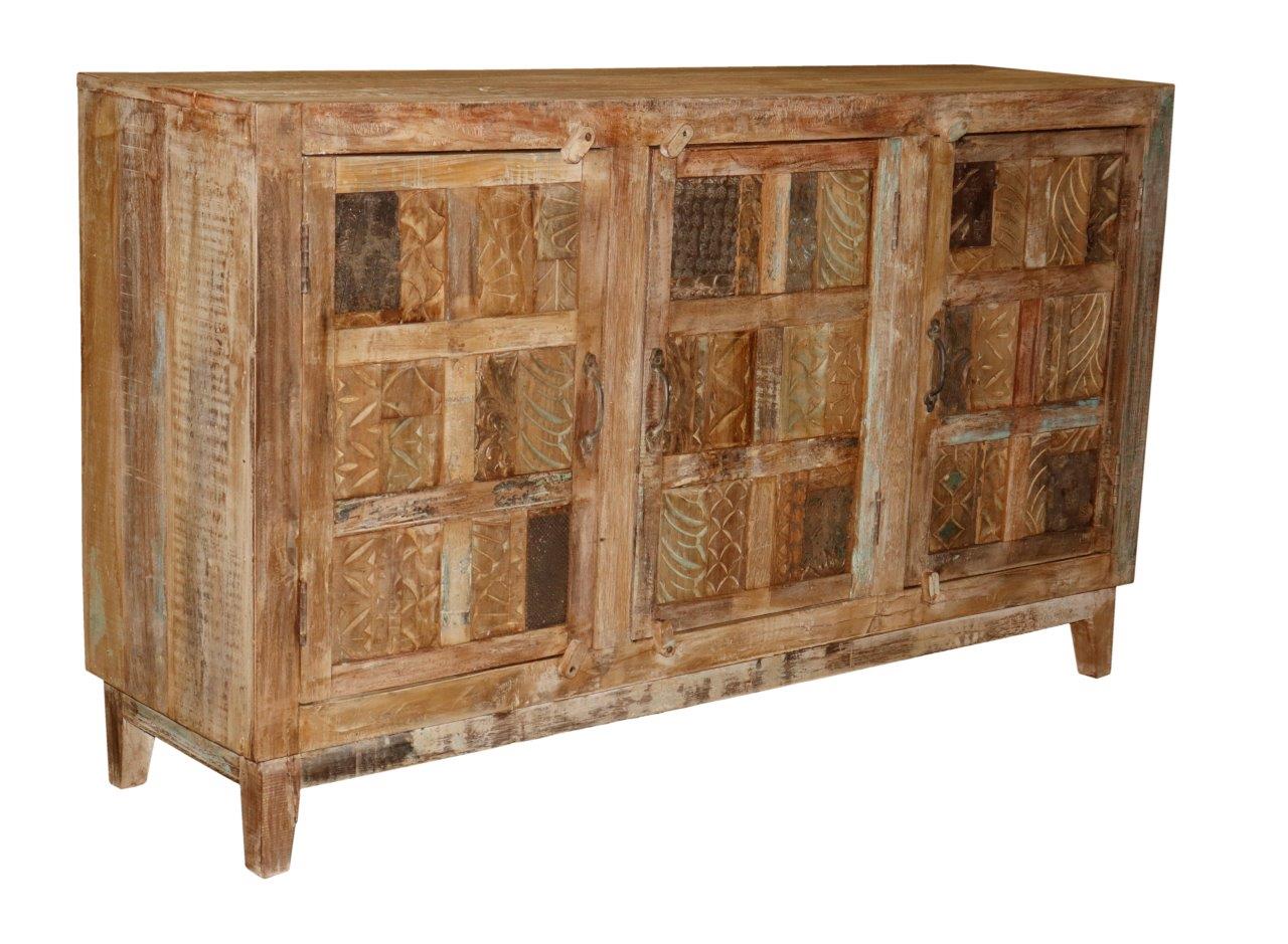 The standout feature of this piece is the intricate patchwork design across its three doors. Each door is divided into a grid of six panels, featuring varied hand-carved textures, geometric motifs, and subtle washes of turquoise and ochre. With its clean rectangular silhouette and elegant tapered legs, this majestic reclaimed wood sideboard offers substantial storage while serving as a unique, multi-tonal focal point for a luxury dining room or entryway.