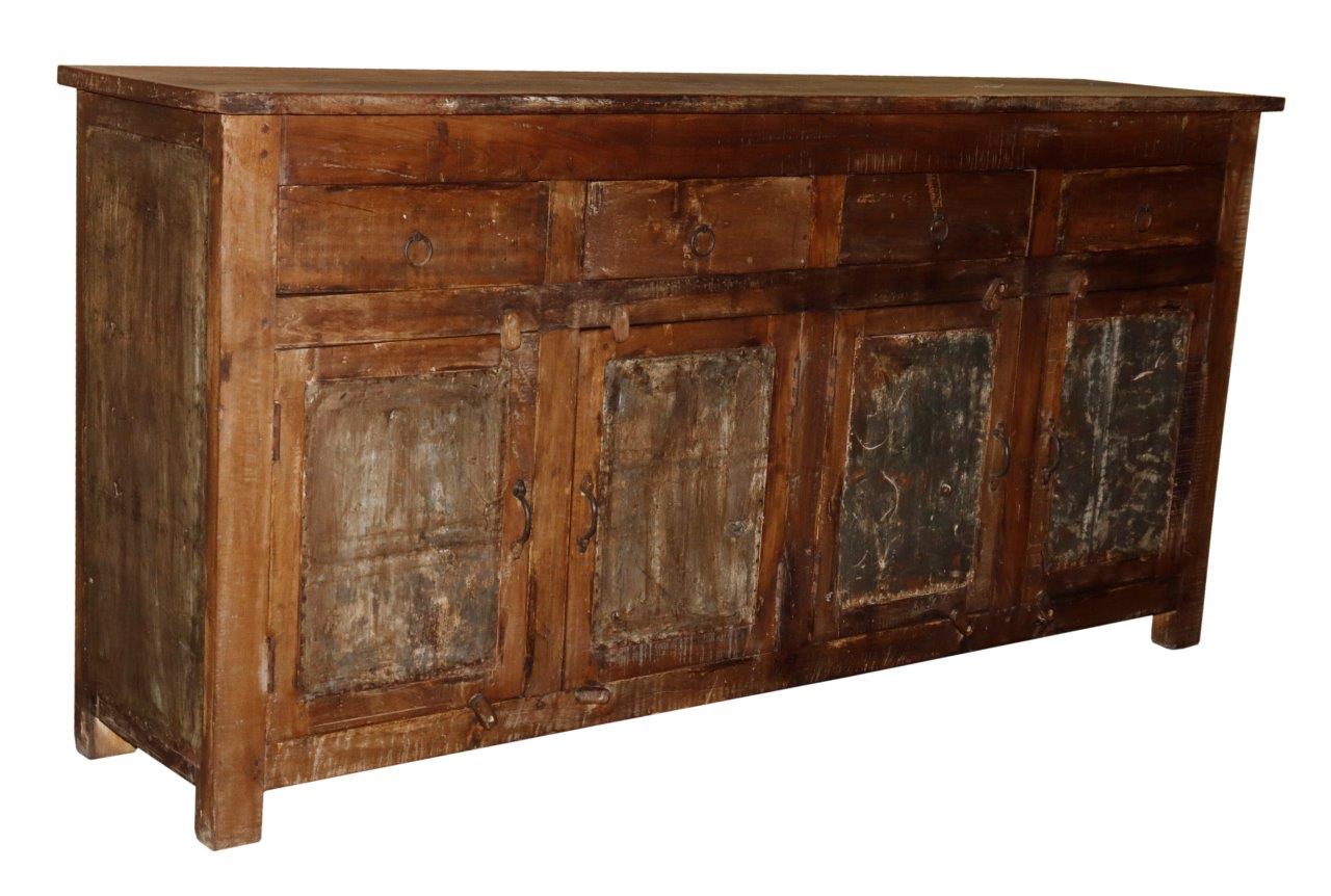 Exude timeless, rustic charm with the Antique Reclaimed Wood 4 Door Buffet. This premium storage piece is masterfully handcrafted from solid wood, featuring a deep, dark chestnut finish that radiates warmth and history.