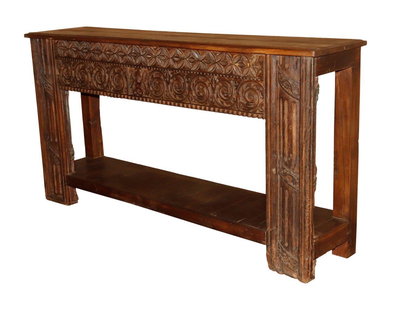 The design is defined by its majestic hand-carved frieze, which showcases a dual-layered relief of floral rosettes and swirling acanthus medallions. This artisan carving extends to the massive vertical pillars, creating a sense of structural permanence reminiscent of historical manor architecture. With its slim profile, generous top surface, and functional lower solid wood shelf, this reclaimed wood style table offers the perfect blend of luxury display and timeless rustic soul.