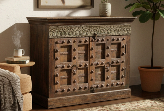 This magnificent Reclaimed Wood Cabinet is a true statement of royal elegance and craftsmanship. Its rich, dark wood frame holds two grand doors, each deeply carved with a studded, antique-style pattern that evokes the feel of an old-world palace.
