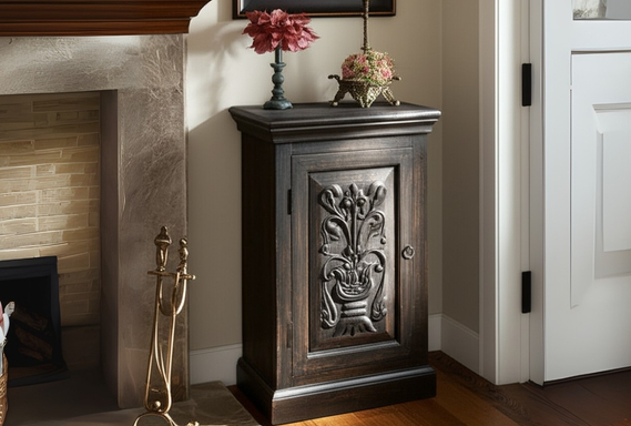 The cabinet features a single door adorned with a majestic bas-relief carving of a blooming floral urn. The clean, architectural lines of the crown molding and base provide a stately silhouette, making these pieces perfect for use as symmetrical nightstands in a luxury bedroom or as elegant pedestals for displaying art in a grand hallway.
