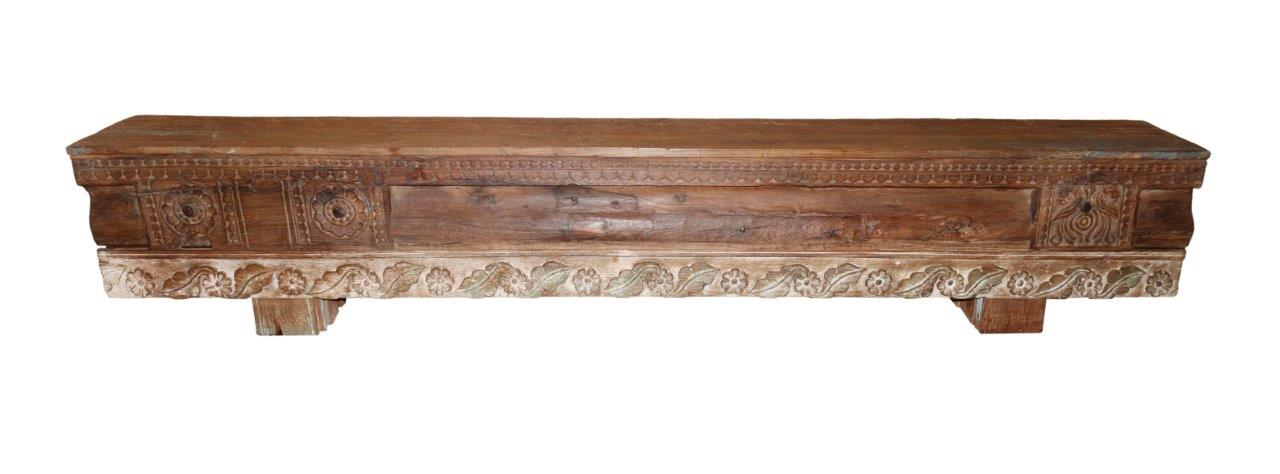 The facade of this bench is a masterpiece of artisan storytelling, featuring a multi-layered frieze of majestic hand-carvings. The upper border boasts intricate geometric patterns and circular floral medallions, while the lower base is defined by a lush, continuous relief of foliate scrolls and blooming rosettes finished with a delicate whitewash patina. Resting on low-profile, sturdy block feet, this reclaimed wood style bench serves as a stunning focal point for a grand entryway, at the foot of a luxury bed, or as an architectural display plinth in a high-end gallery.