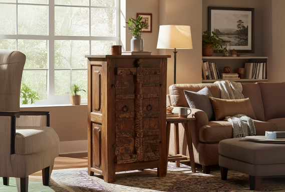 Infuse your home with the soulful charm of the Mediterranean with the Royal Artisan Carved Heritage Almirah. This premium accent cabinet is handcrafted from solid, honey-toned wood, featuring a stunning sun-bleached patina and a distressed finish that speaks of timeless history.