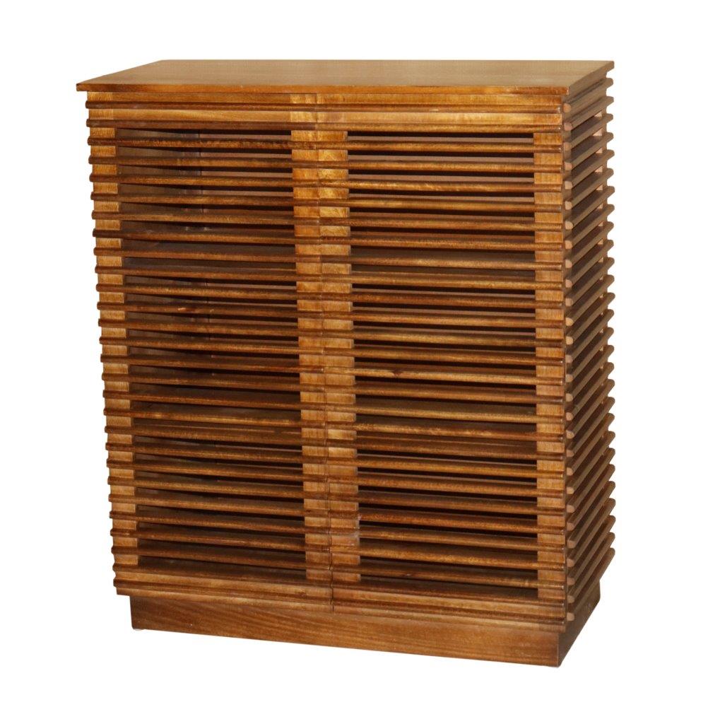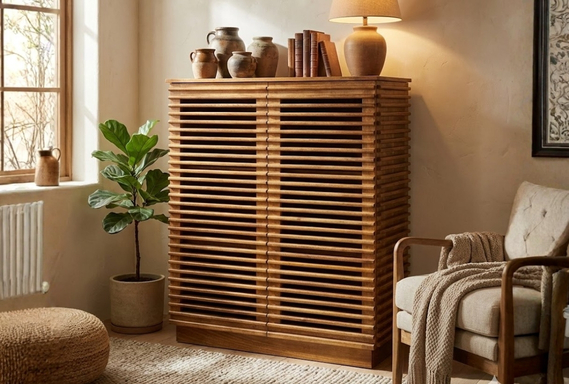 The design is truly majestic, showcasing a 2-door facade defined by intricate horizontal artisan slats that create a sophisticated play of light and shadow. This linear, louvre-style texture provides a modern architectural edge while concealing ample vertical storage for fine linens, spirits, or media. Resting on a sturdy, recessed solid wood plinth base, this artisan buffet serves as a soulful and functional centerpiece for luxury organic-modern interiors.