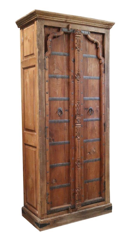 The design is truly majestic, showcasing twin doors accented with horizontal iron strapping and hand-applied metal studs, reminiscent of ancient manor gates. The central vertical pillar and internal door frames feature intricate artisan hand-carvings, including a delicate arched header that softens the cabinet’s imposing silhouette. Finished with traditional iron ring pulls, this reclaimed wood style armoire offers a lifetime of structural permanence and historical soul for luxury living suites or grand dining halls.
