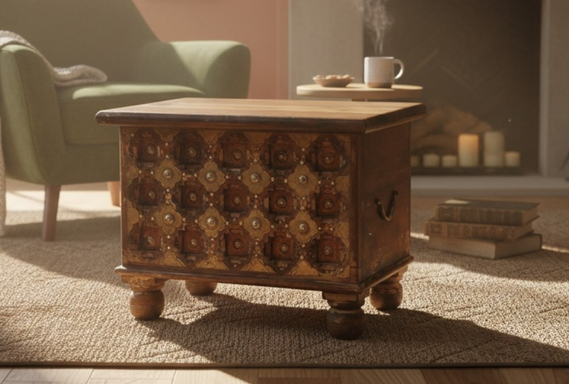 Infuse your home with a sense of regal history and intricate artisan craftsmanship with the Solid Wood Brass-Studded Chest. This premium storage piece is handcrafted from substantial solid wood, featuring a smooth, dark walnut-toned lid that provides a sophisticated contrast to its highly decorative body.