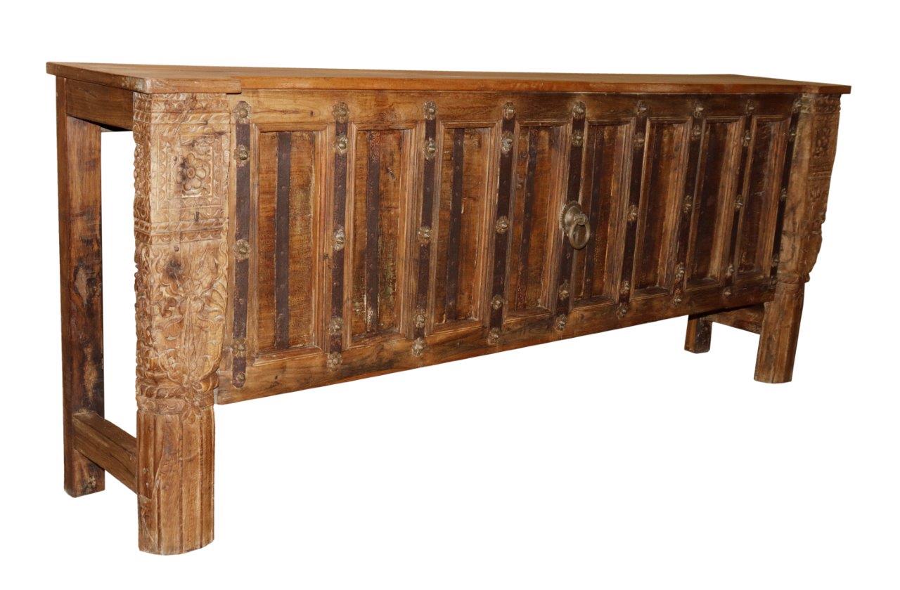 The facade is a work of artisan excellence, composed of vertical reclaimed wood panels reinforced with traditional iron straps and decorative floral studs. A central, heavy-duty iron ring pull serves as a majestic focal point on the textured front. The structure is anchored by two massive, hand-carved corner pillars featuring intricate floral reliefs and deep vertical fluting, providing an architectural presence that commands any room. With its expansive top and open-back gallery design, this solid wood console is the ultimate anchor for a grand foyer or a luxury living suite.