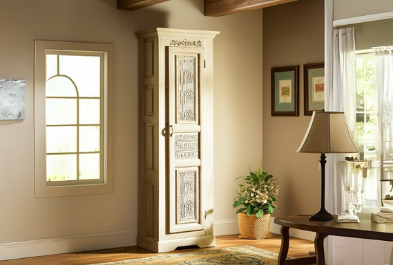 The defining feature of this armoire is its tall, slender door, which showcases three vertical panels of intricate hand-carved relief work. These carvings feature traditional floral scrolls and geometric "Greek key" motifs, all rendered in the same weathered wood for a subtle, sophisticated texture. With its recessed side panelling and sturdy crown molding, this royal armoire is an ideal luxury solution for organizing linens or garments in narrow spaces.