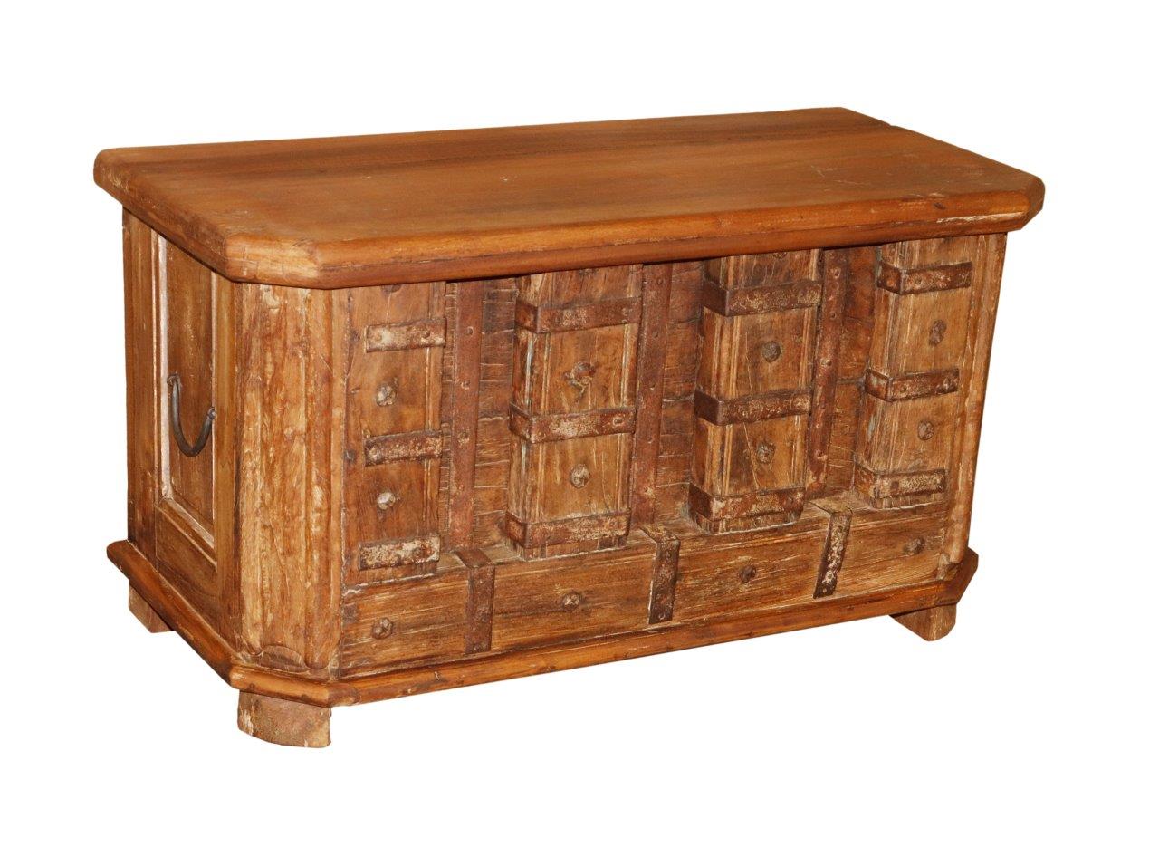 The facade of this chest is truly majestic, designed with vertical solid wood pillars reinforced by heavy-duty iron banding and hand-applied metal studs. The architectural recessed paneling creates deep shadows and visual interest, while the substantial mitered top and base provide a sense of grounded permanence. Equipped with traditional hand-forged iron ring handles on the sides, this reclaimed wood style trunk offers generous storage for blankets or heirlooms while doubling as a rugged, artisan coffee table in any luxury interior.