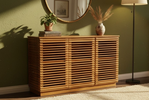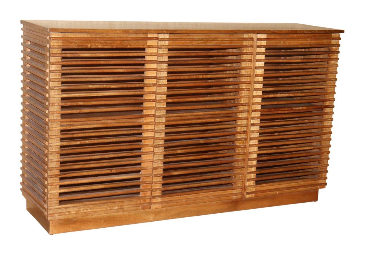 The design is truly majestic, showcasing a 3-door facade defined by intricate horizontal artisan slats. This louvre-style texture creates a sophisticated play of light while maintaining a clean, linear silhouette. Resting on a low-profile solid wood plinth base, this versatile buffet provides massive internal storage for dinnerware and linens, making it an ideal centerpiece for luxury modern or organic-minimalist interiors.