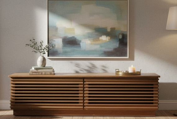 Introduce a masterclass in texture and architectural form with the Solid Wood Linear Slatted Buffet. This premium statement piece is masterfully constructed from substantial solid wood, featuring a warm, mid-tone finish that radiates the authentic character of reclaimed wood.