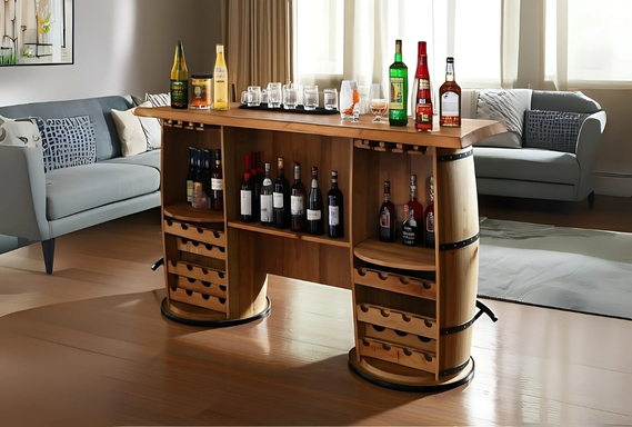 Elevate your home with the Solid Wood Reclaimed Barrel Bar, a piece designed for the true connoisseur of royal luxury. This majestic bar is expertly crafted from reclaimed wood barrels, showcasing a rich, natural finish and sturdy metal bands that speak of timeless elegance.