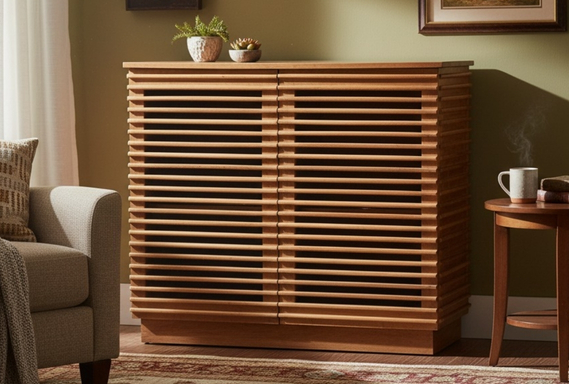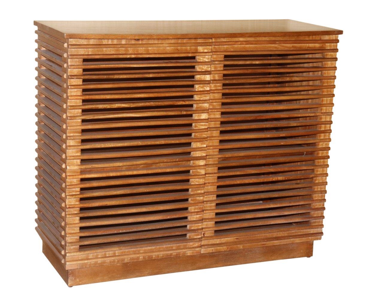 The design is truly majestic, defined by a facade of horizontal artisan slats that create a rhythmic play of light and shadow across the front. This tiered texture provides a sophisticated louvre-style look while concealing ample internal shelving for fine china, linens, and barware. Resting on a sturdy, recessed plinth base, this artisan buffet serves as a commanding focal point that bridges the gap between mid-century warmth and contemporary luxury.