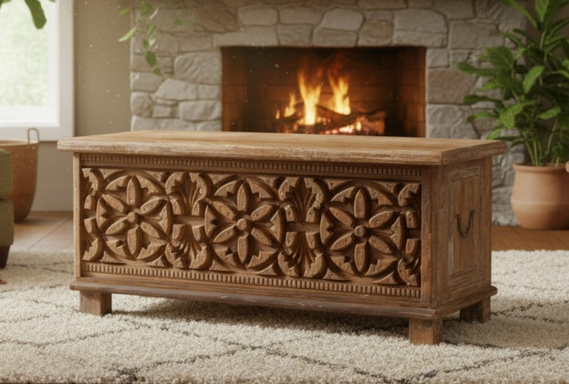 The facade of this chest is a masterpiece of artisan woodwork, showcasing a continuous, majestic deep-relief carving of interlocking floral medallions and sunburst motifs. The ornate front is bordered by a classic dentil-style trim, while the sides feature traditional hand-forged iron ring handles and subtle whitewash distressing. Resting on sturdy squared block feet, this reclaimed wood style trunk offers generous storage for linens or keepsakes while doubling as a stunning, conversation-starting coffee table.