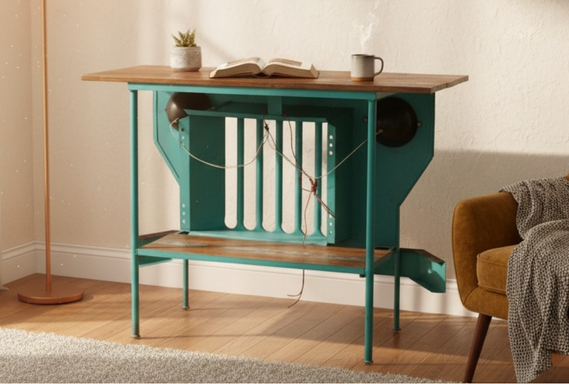 The base is finished in a majestic tri-color teal, white, and rust patina, providing a vibrant industrial foundation for the slim-profile solid wood top. The natural, weathered grain of the reclaimed wood surface offers a warm organic contrast to the cold-rolled steel of the vehicle facade. Perfect for a luxury man-cave, a boutique garage suite, or an eclectic industrial lounge, this artisan console includes a discreet lower solid wood shelf for glassware or collectibles.