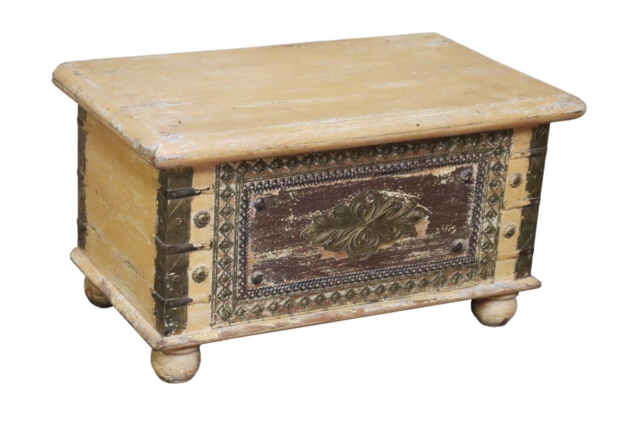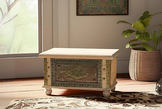 Infuse your home with the timeless elegance of this Antique Brass-Fitted Storage Chest. This premium storage piece is masterfully handcrafted from solid wood with a soft, natural finish and elevated on sturdy bun feet.
