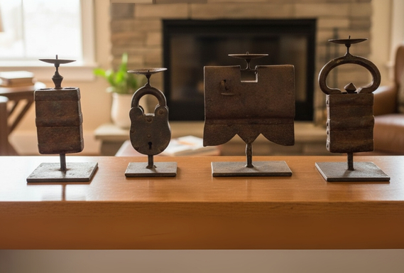 Bring the weight of history and industrial soul to your home with the Assorted Antique Metal lock candle holders. This premium set of four decorative artifacts is handcrafted from weathered, rustic iron, featuring silhouettes inspired by ancient locks and traditional foundation tools.
