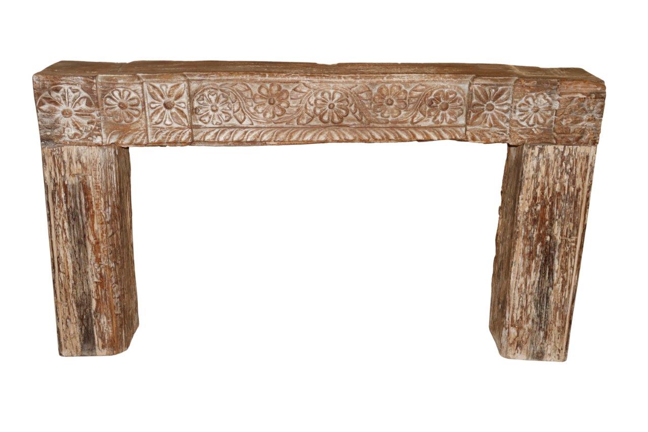 The horizontal frieze is a masterpiece of artisan woodwork, showcasing a continuous line of majestic hand-carved floral medallions and rosettes. Supported by two massive, block-style legs with an authentic weathered patina, the table's open "arch" design provides a sense of airy grandeur despite its sturdy reclaimed wood aesthetic. Whether placed in a grand foyer or behind a luxury sofa, this console serves as a timeless bridge between historical craftsmanship and contemporary rustic living.
