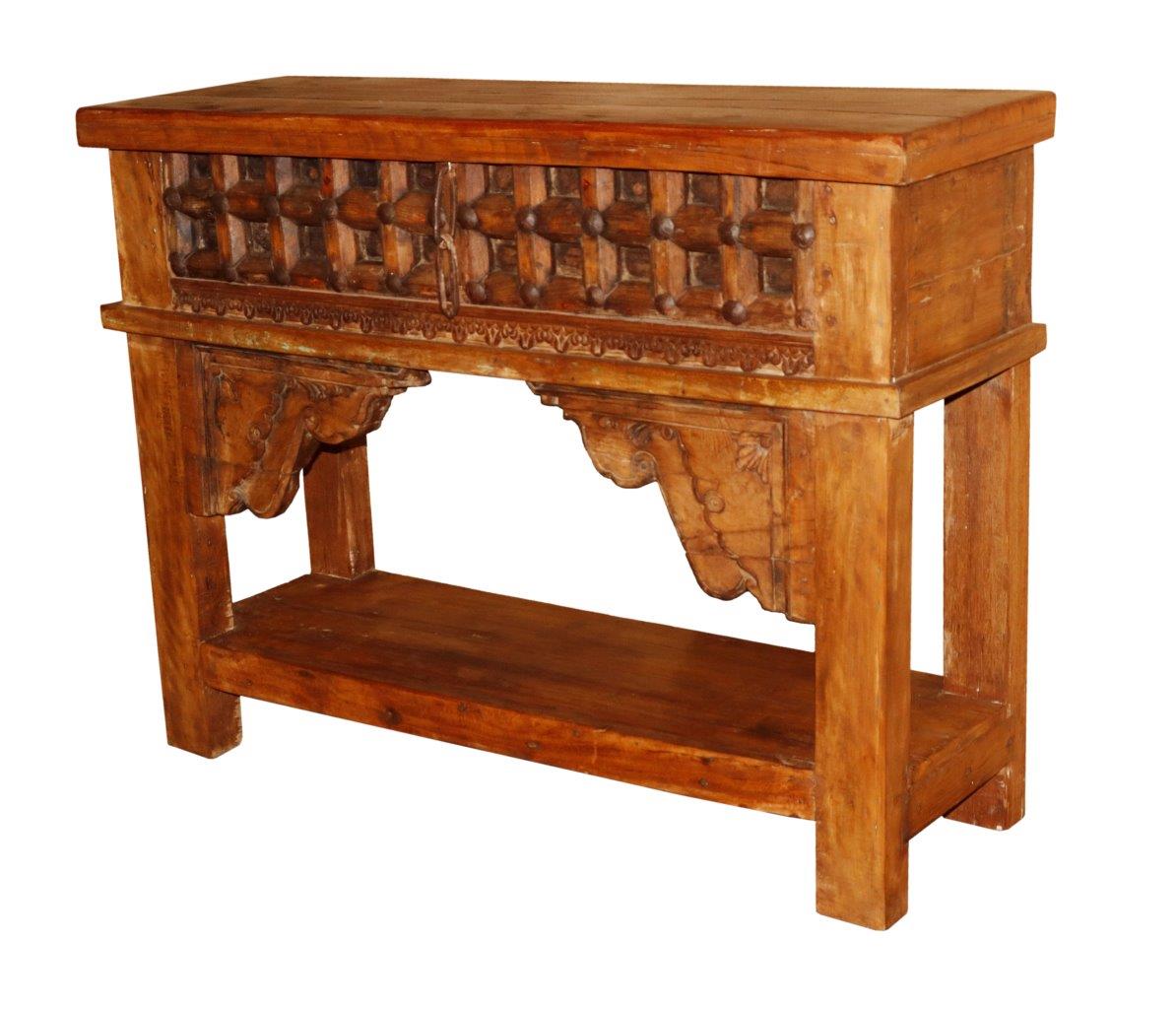 The standout feature of this solid wood table is its intricate facade, which boasts a majestic hand-carved lattice design accented by traditional iron studs. Below the substantial top, the table is supported by thick, squared legs and artisan carved corbels that add a sense of architectural grandeur. A full-length lower shelf provides additional space for displaying curated decor, making this reclaimed wood style console as functional as it is beautiful.