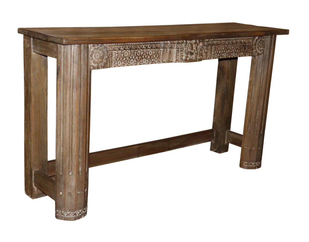 The defining feature of this solid wood console is the extraordinary horizontal frieze, which is deep-carved with majestic floral medallions and leafy vine scrolls. Complementing this decorative front are four substantial fluted legs, each finished with delicate carved detailing at the base for a truly artisan touch. With its generous length and slim profile, this royal table is an ideal luxury focal point for a grand foyer, behind a sofa, or as a curated display in a formal dining room.