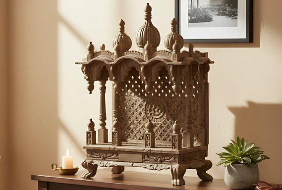 Adorn your home with this breathtaking Intricately Carved Wooden Temple, a piece that truly feels premium and royal. Every part is covered in exquisite, detailed carving, showcasing a timeless artistry that is both delicate and grand.