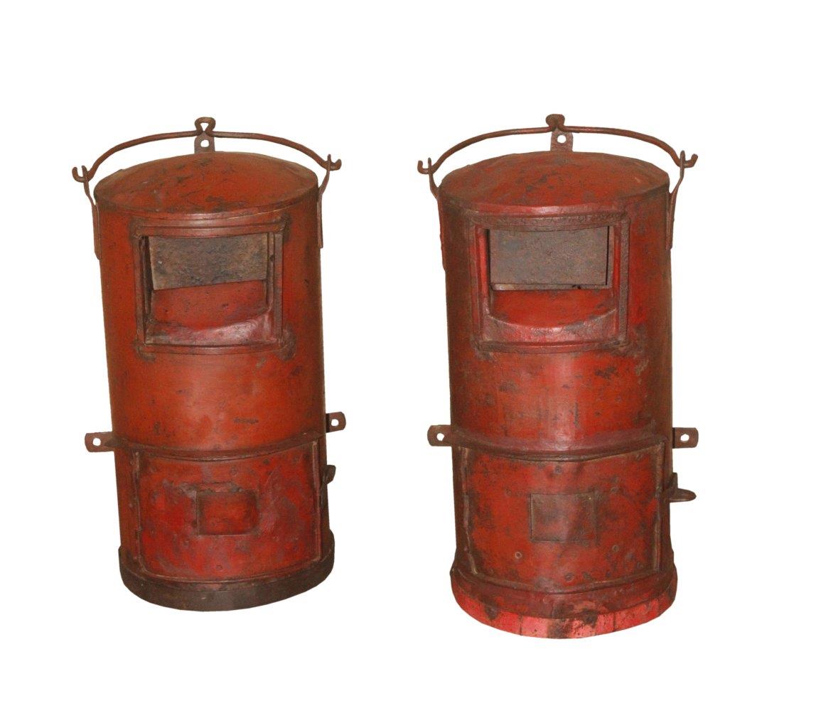 Each piece features a majestic industrial silhouette with a functional top handle, a slotted mail entry, and a hinged lower retrieval door. The authentic, distressed finish provides a vibrant artisan contrast when placed alongside a solid wood console or atop a reclaimed wood merchant's chest. These "found object" statement pieces serve as both historical conversation starters and unique tabletop sculptures for luxury rustic interiors.