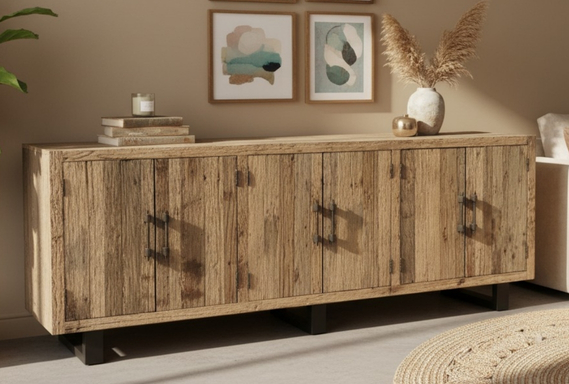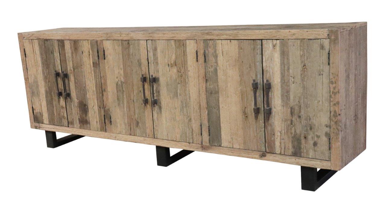 The design is truly majestic, offering an expansive surface area perfect for serving and display. This artisan buffet features six seamless doors, each secured with heavy-duty, hand-forged iron bolt handles that provide a rugged, industrial contrast to the soft wood tones. Supported by contemporary black-finished solid wood angled feet, this reclaimed wood style piece offers massive internal storage for linens, dinnerware, and fine spirits, making it the ultimate functional centerpiece for luxury entertaining.