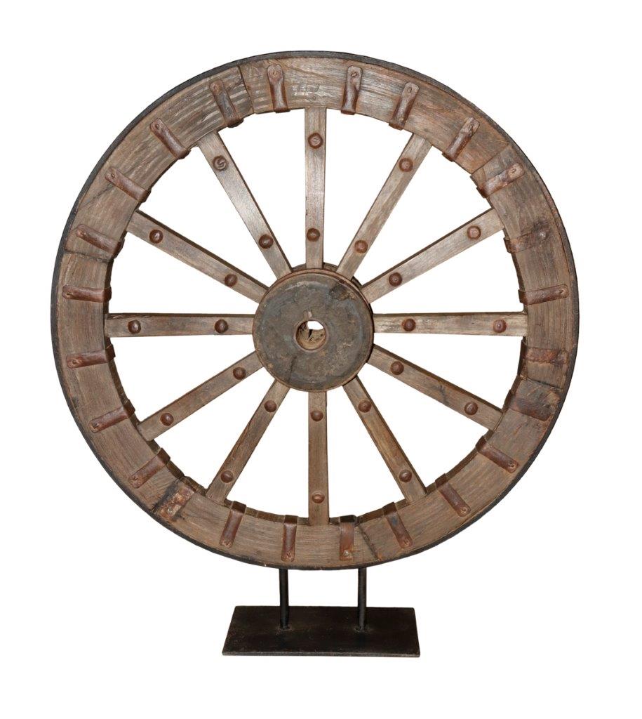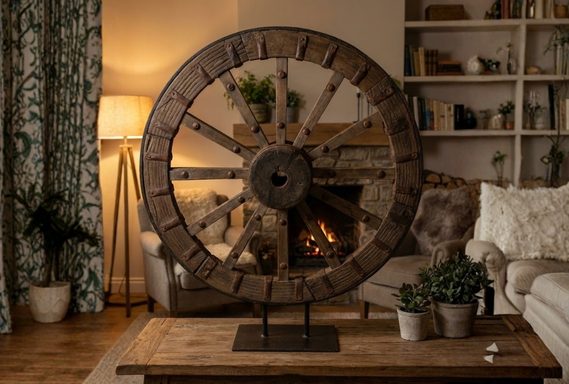 Invite the timeless spirit of the open road into your interior with thePremium Vintage Teak Cart Wheel on Stand. This premium decorative object is a masterclass in rustic industrialism, featuring an authentic, weathered wooden wheel salvaged from a traditional heritage cart.