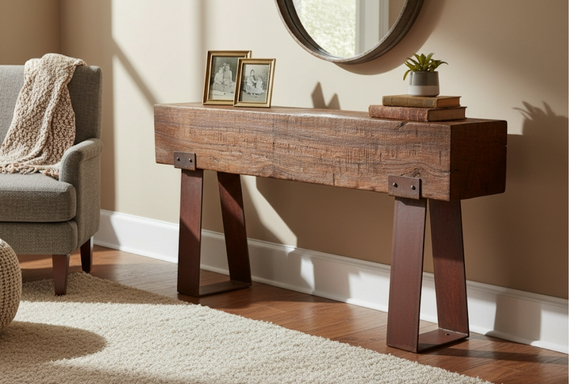 Embrace the beauty of raw materials with the Reclaimed Beam Console Table. This premium statement piece features a massive, solid wood beam with a rich, natural grain and deep textural character.