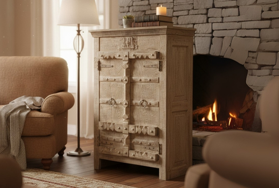 The natural, weathered finish of the reclaimed wood gives it an authentic, royal charm, while its solid presence speaks to premium quality. This isn't just a cabinet; it's a unique statement piece that offers generous hidden storage and a touch of historical grandeur to any room.