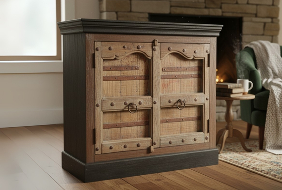 This stunning Reclaimed Wood Cabinet is a masterful blend of rustic charm and royal presence. Crafted from wood with beautiful, natural markings, its two front doors are the focal point.