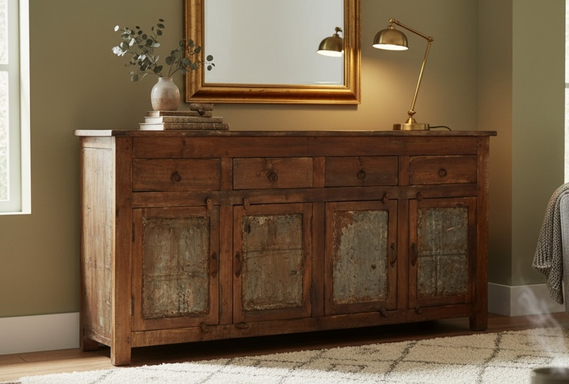 Exude timeless, rustic charm with the Antique Reclaimed Wood 4 Door Buffet. This premium storage piece is masterfully handcrafted from solid wood, featuring a deep, dark chestnut finish that radiates warmth and history.