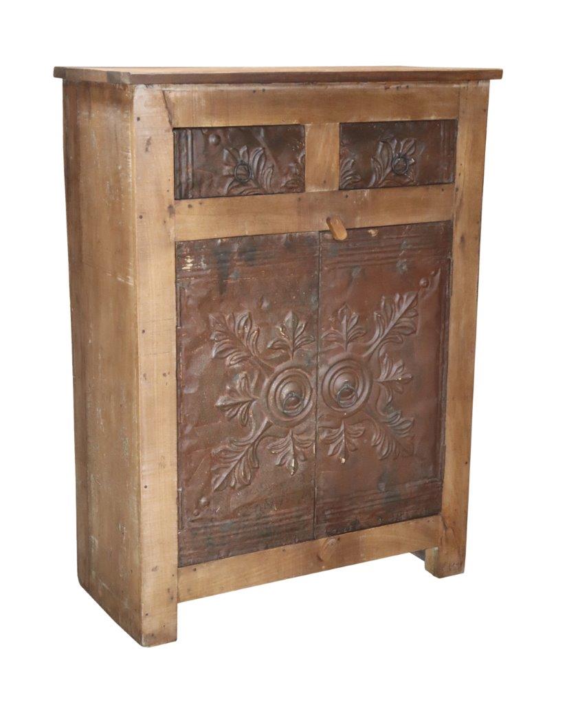 The cabinet features two top drawers and a spacious double-door cupboard, all adorned with spectacular hand-embossed floral medallions. With its simple silhouette and intricate metalwork, this majestic sideboard serves as a breathtaking focal point for a dining room or entryway, offering a royal blend of rustic charm and artistic luxury.