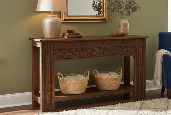 The design is defined by its majestic hand-carved frieze, which showcases a dual-layered relief of floral rosettes and swirling acanthus medallions. This artisan carving extends to the massive vertical pillars, creating a sense of structural permanence reminiscent of historical manor architecture. With its slim profile, generous top surface, and functional lower solid wood shelf, this reclaimed wood style table offers the perfect blend of luxury display and timeless rustic soul.