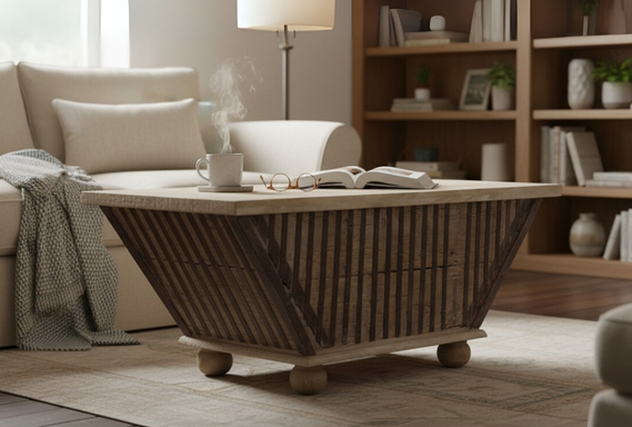 Command attention with the Reclaimed Wood Architectural Trough Coffee Table. This premium statement piece features a thick, smooth solid wood top that provides a clean surface for display or seating, contrasted by a rugged, historical base.