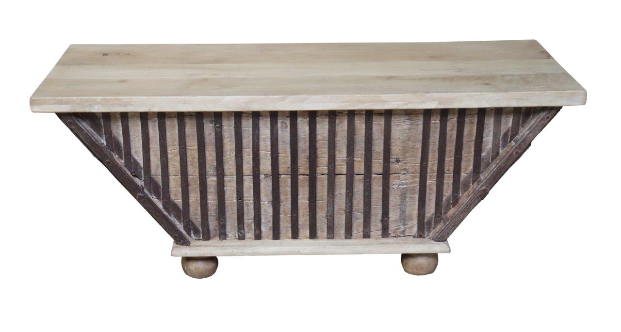 The base is crafted from reclaimed wood in a unique, tapered trough silhouette, reinforced with majestic vertical iron straps and rivet detailing. Resting on traditional bun feet, this piece serves as a bridge between industrial strength and rustic elegance. Whether used as a bold entryway bench, a low-profile media console, or a centerpiece coffee table, its artisan construction ensures it brings an authentic heritage feel to any high-end interior.