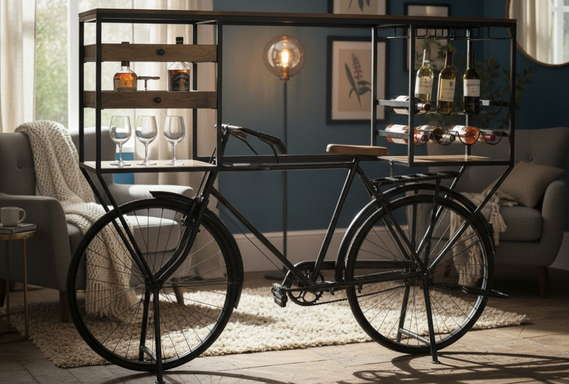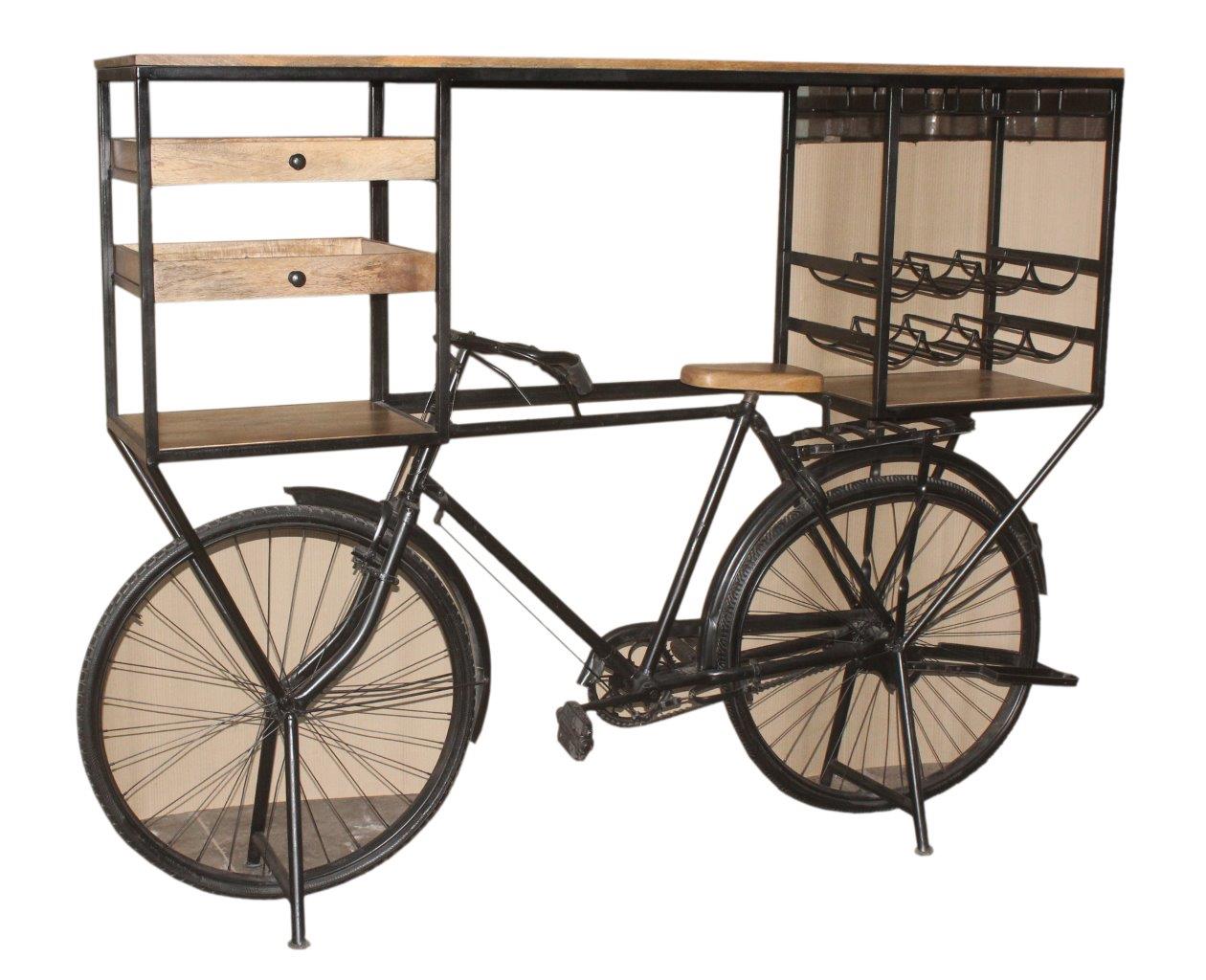 Make a grand, unforgettable statement with this remarkable Reclaimed Wood Bicycle Bar. This unique piece is crafted from a vintage-style metal bicycle frame, supporting a premium wood tabletop and ample storage.