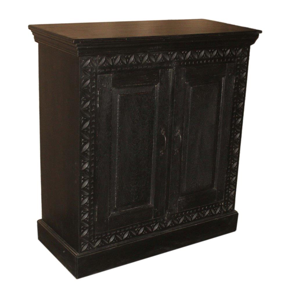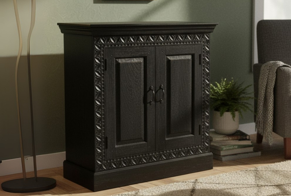 The two doors are framed by intricate, deep carvings that add a powerful, premium layer of texture and artistry. This is a simple, elegant way to introduce a magnificent statement piece that offers ample hidden storage for any room in your home.