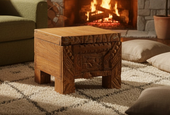 Elevate your interior styling with the intricate artistry of the Reclaimed Wood Carved Accent Table. This premium multipurpose piece is masterfully handcrafted from substantial solid wood, featuring a warm, honey-toned finish that highlights the authentic grain and storied texture of the timber.