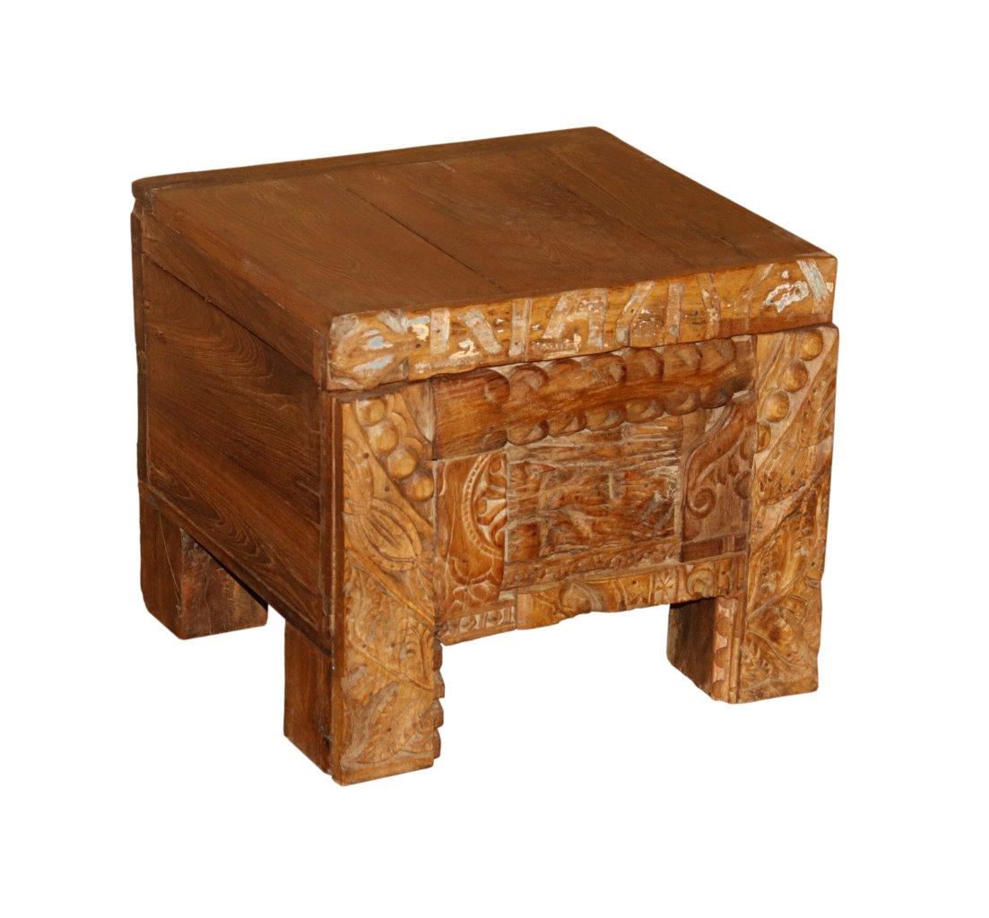The design is truly majestic, showcasing deep-relief artisan carvings on all visible faces. The front panel features a central floral medallion framed by lush acanthus leaf borders, while the sturdy corner pillars are adorned with traditional scrolling motifs. With its flat, smooth top and structural permanence, this reclaimed wood style piece serves perfectly as a unique side table, a soulful plant stand, or a decorative gallery plinth for luxury rustic homes.