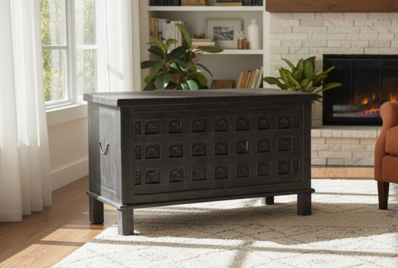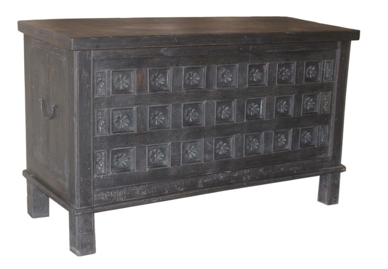 Indulge in the regal beauty of this Reclaimed Wood Storage Chest, finished in a dramatic, rich black. Its front is exquisitely detailed with rows of deeply carved panels, each featuring a delicate floral motif that speaks of royal artistry.