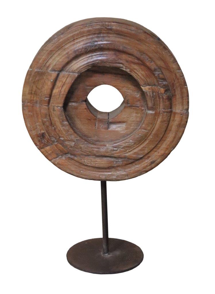 The sculpture is defined by its majestic concentric ring design, carved into a heavy circular block with a singular central void. Elevated on a minimalist matte-black iron pedestal, the reclaimed wood disk appears to float, allowing its organic form and historical patina to command attention. Whether placed on a library shelf, a grand console, or a mantelpiece, this artisan artifact serves as a sophisticated bridge between primitive history and modern luxury.