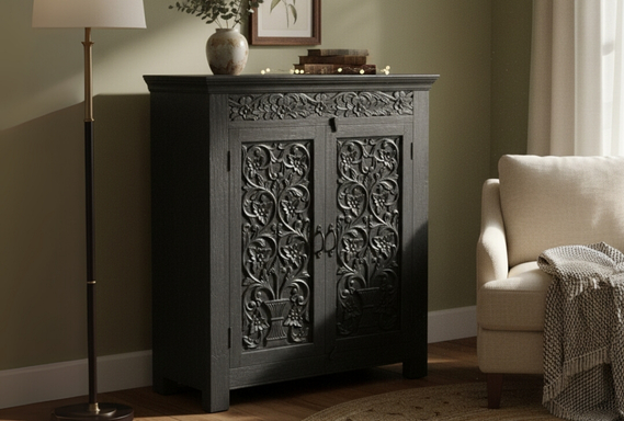 Introduce rustic charm and elegance to your home with our Reclaimed Wood Hand Carved 2 Door Cabinet. This beautiful piece features intricate hand-carved designs on reclaimed wood, offering a unique and eco-friendly aesthetic. With two spacious doors, it provides ample storage space while adding a touch of artistic sophistication to any room.
